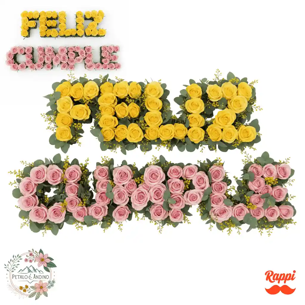 Un detalle divertido y colorido para cumpleaños, hecho completamente con flores frescas que forman la frase más alegre del día.