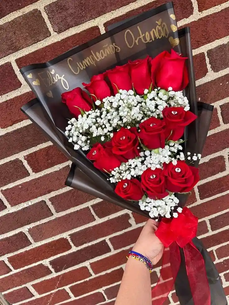 Incluye: Rosas rojas x12 escalonadas, yirtzofilia, decoracion y mensaje de feliz cumpleaños