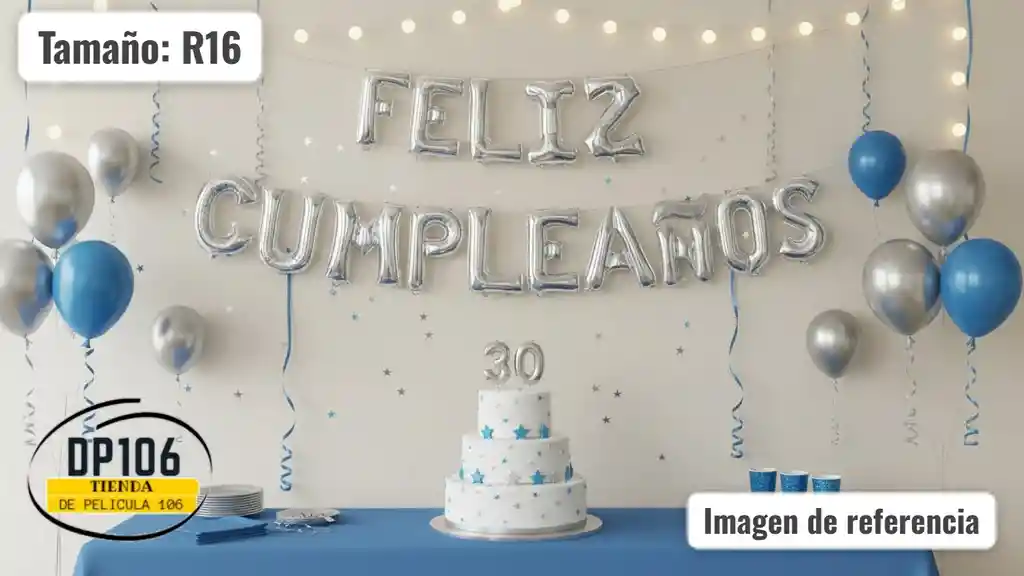 Todas los globos metalizados de FELIZ CUMPLEAÑOS , Tamaño R16 = 41 cm, mas cinta plateada .