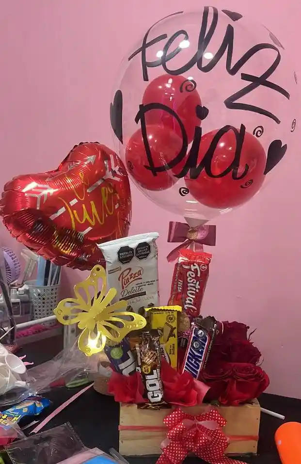 Contiene : caja de madera, rosas rojas x6, globo transparente decorado, globo de corazon galletas festival x1, gol x1, gol pequeño x1, galleta nucita x1, piazas, snicker´s x1, decoracion y mensaje personalizado
