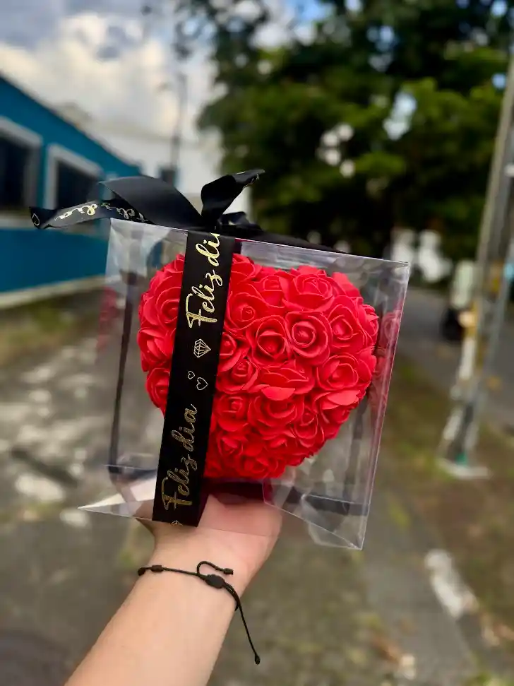 ¡Feliz Día! Corazón de Rosas Artificiales, Corazón de rosas hecho en foami con su respectiva caja 16cm x 16cm