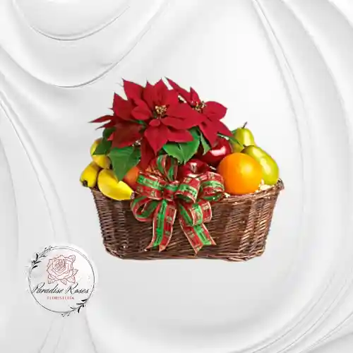 Canasta navideña contiene flor poinsettia color roja frutas, manzana, banano, naranja y pera.