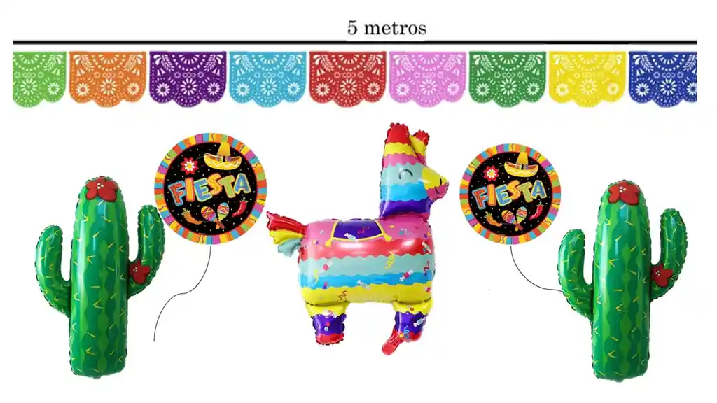 Combo de fiesta Mexicana 1 guirnalda de 5 metos 2 Globos de cactus 2 globos de fiesta 1 globo de piñata mexicana nota: globos se envian sin inflar -