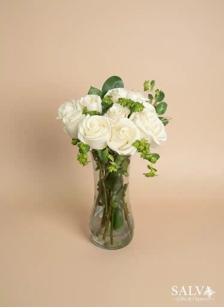 Hermoso florero de 12 rosas seleccionadas, ideal para acompañar a un ser querido durante un proceso de duelo, o simplemente acompañar. Condolencias, Paz, Tranquilidad, Compañía.