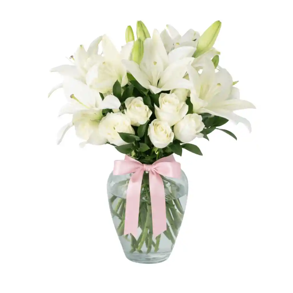 Un detalle fresco y lleno de vida que transmite pureza y alegría en cada flor. Este elegante arreglo incluye un jarrón de 30 cm con delicadas rosas blancas, tallos de lirios y follaje fresco, cuidadosamente combinados para crear una presentación armoniosa y sofisticada. Se complementa con un moño decorativo , ideal para expresar tus sentimientos en cualquier ocasión especial. 🌿🤍 REF: FLR01