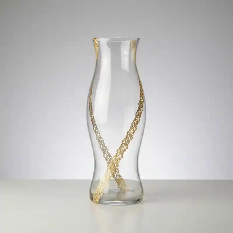 Florero jarrón de vidrio grande con detalle con cinta dorada vintage.