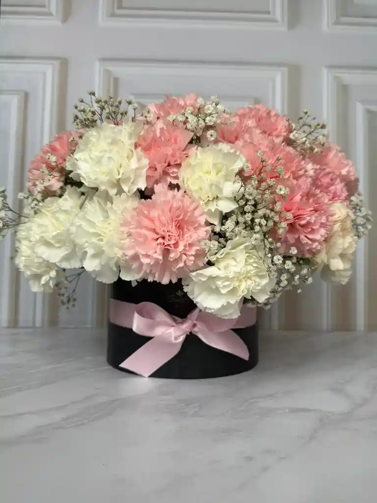 Flores, caja Clavel con claveles de diferentes colores mas follaje en caja, el color de las flores puede variar segun disponibilidad. "Mensaje personalizado" dejar mensaje en el chat.