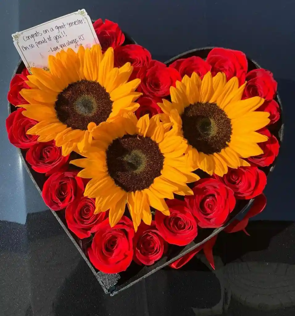 Caja de corazón con rosas y girasoles, incluye tarjeta personalizada GRATIS! Pide ahora y sorprende con elegancia y amor