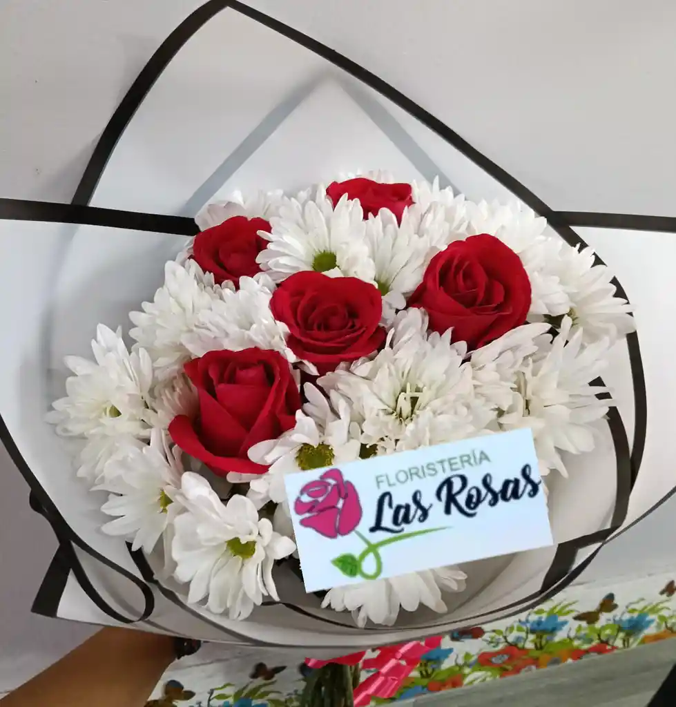 PAQUETE DE MARGARITAS BLANCAS 6 ROSAS ROJAS DECORACION PAPEL COREANO MOÑO Y TARJETA