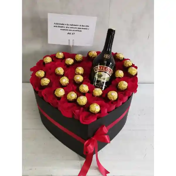 Arreglo en forma de corazón con rosas rojas, chocolates y botella de Baileys