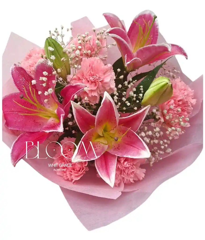 Hermoso bouquet de lirios rosados y claveles rosados de la mejor calidad