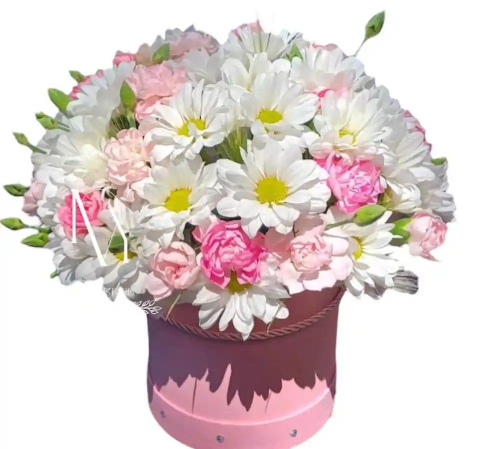 Hermoso bouquet de margaritas y rosas rosadas de ka mejor calidad, en cilindro, un detalle ideal para esa ocasión especial