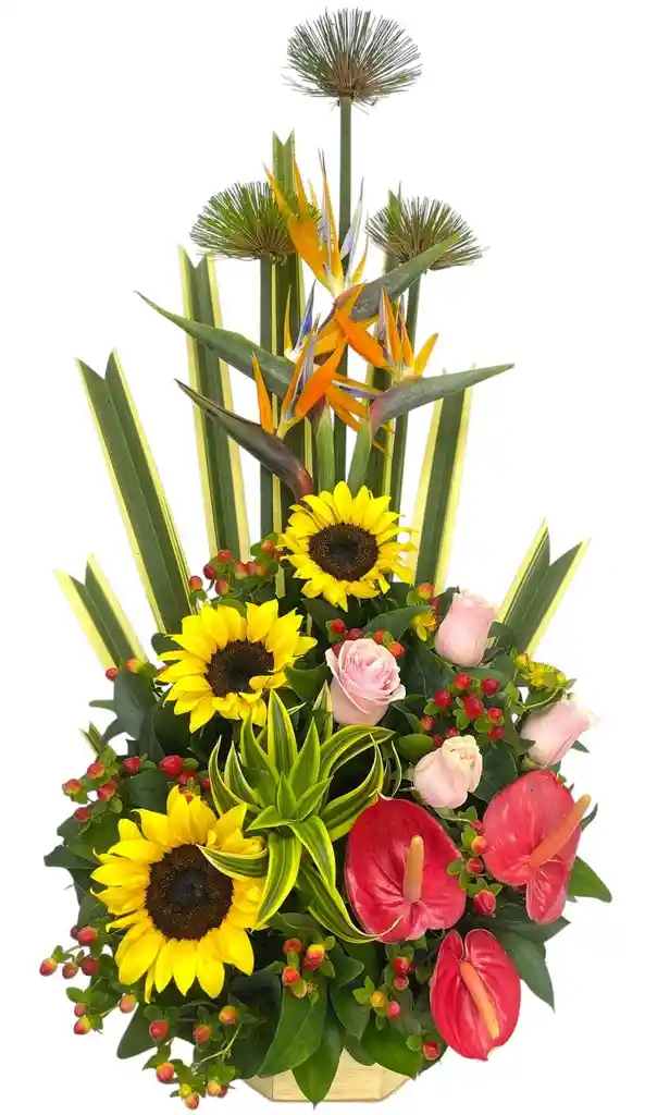 Hermoso arreglo en base de madera con rosas, girasoles y demás flores frescas listas para ser entregadas y alegrarle el día a esa persona especial
