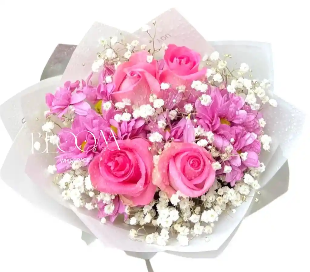 Hermoso bouquet de rosas fucsia con margarita lila, un detalle ideal para esa ocasión especial