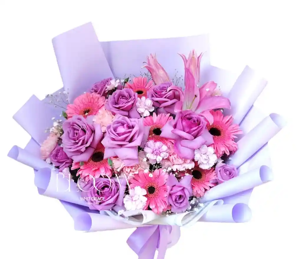 Hermoso bouquet de rosas lila y margarita de la mejor calidad,un detalle ideal para esa ocasión especial