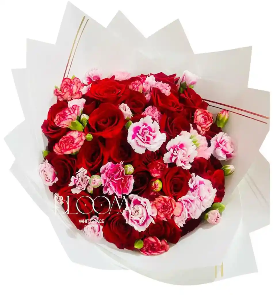 Hermoso bouquet de rosas rojas de la mejor calidad, y claveles de la mejor calidad, un detalle ideal para sorprender en esa ocasión especial