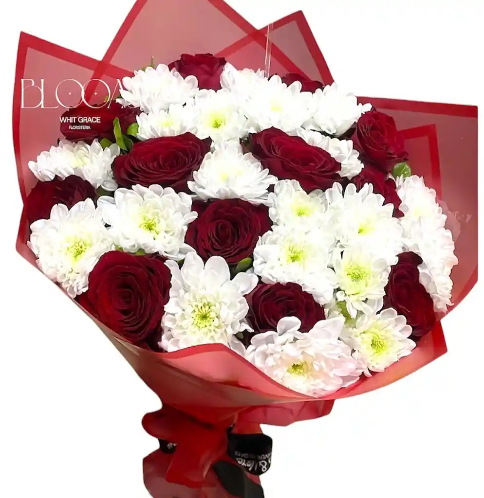 Hermoso bouquet de rosas rojas y margarita blanca fresca lista para ser entregada