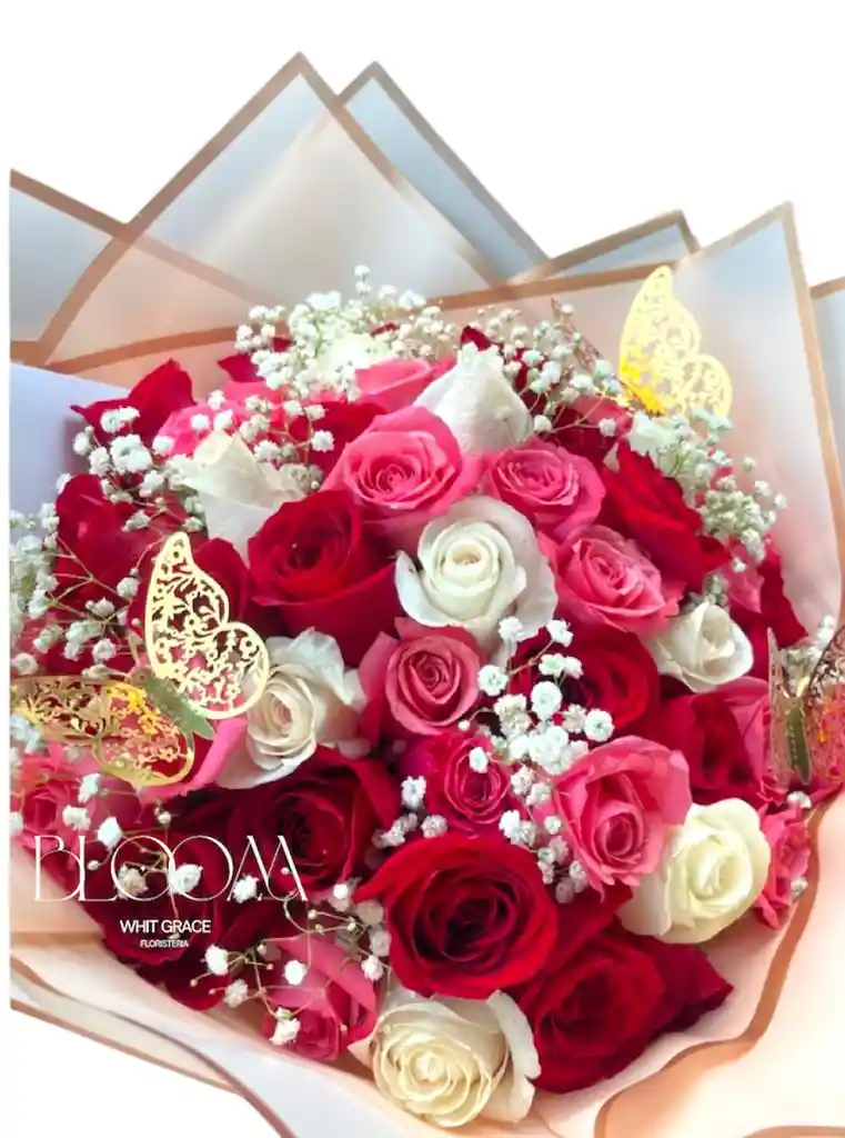 Hermoso bouquet de rosas rojas y rosadas de la mejor calidad, un detalle ideal para esa ocasión especial