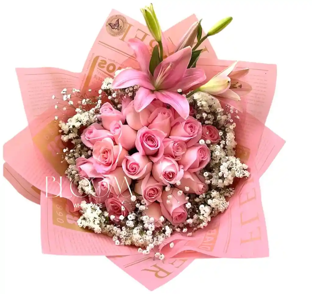 Hermoso bouquet de rosas rosadas de la mejor calidad, acompañadas por hermoso lirios, un detalle ideal para esa ocasión especial