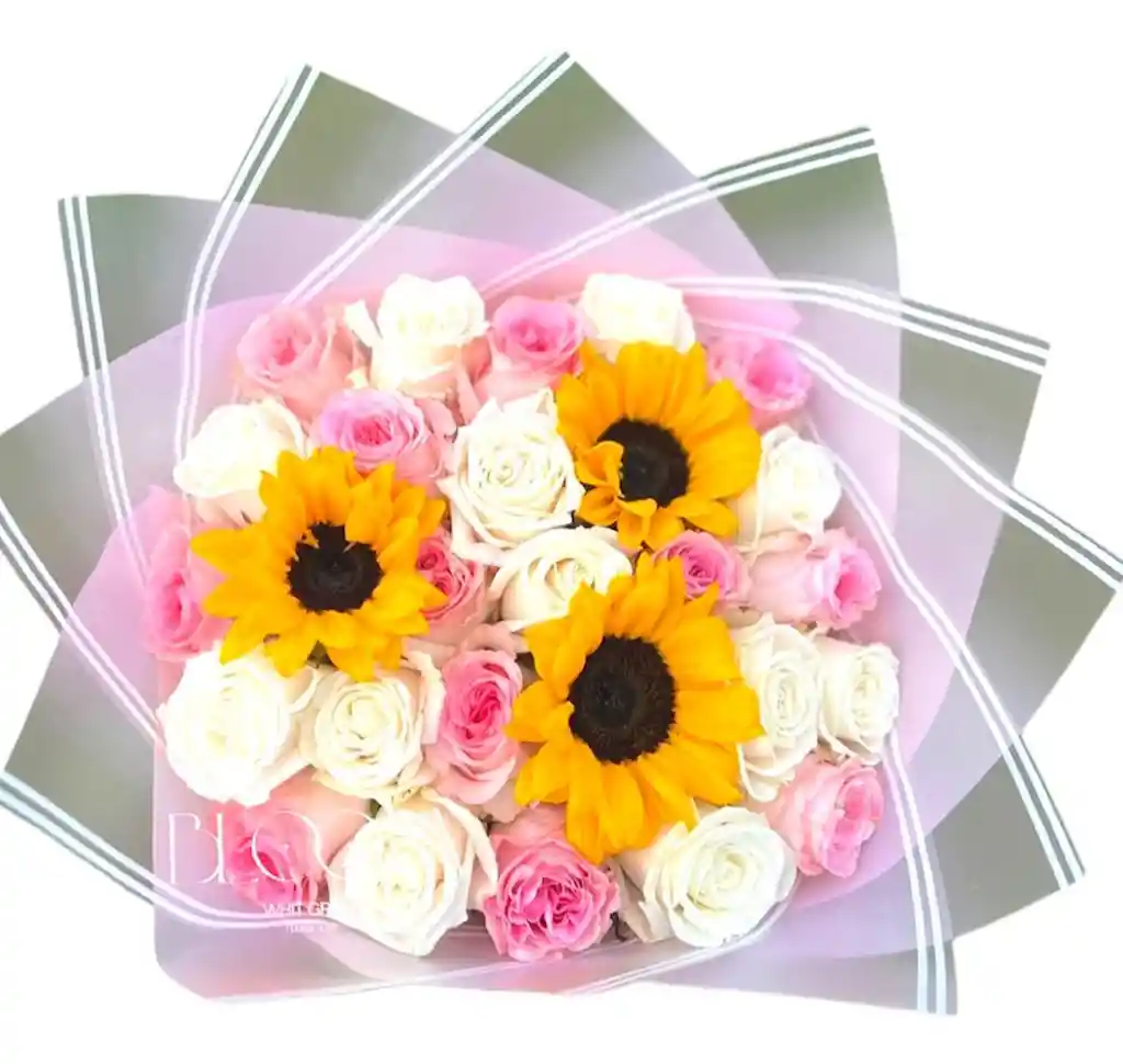 Hermoso bouquet de rosas rosadas, blancas y girasoles, una hermosa combinación para alegrar el día de esa persona que amas
