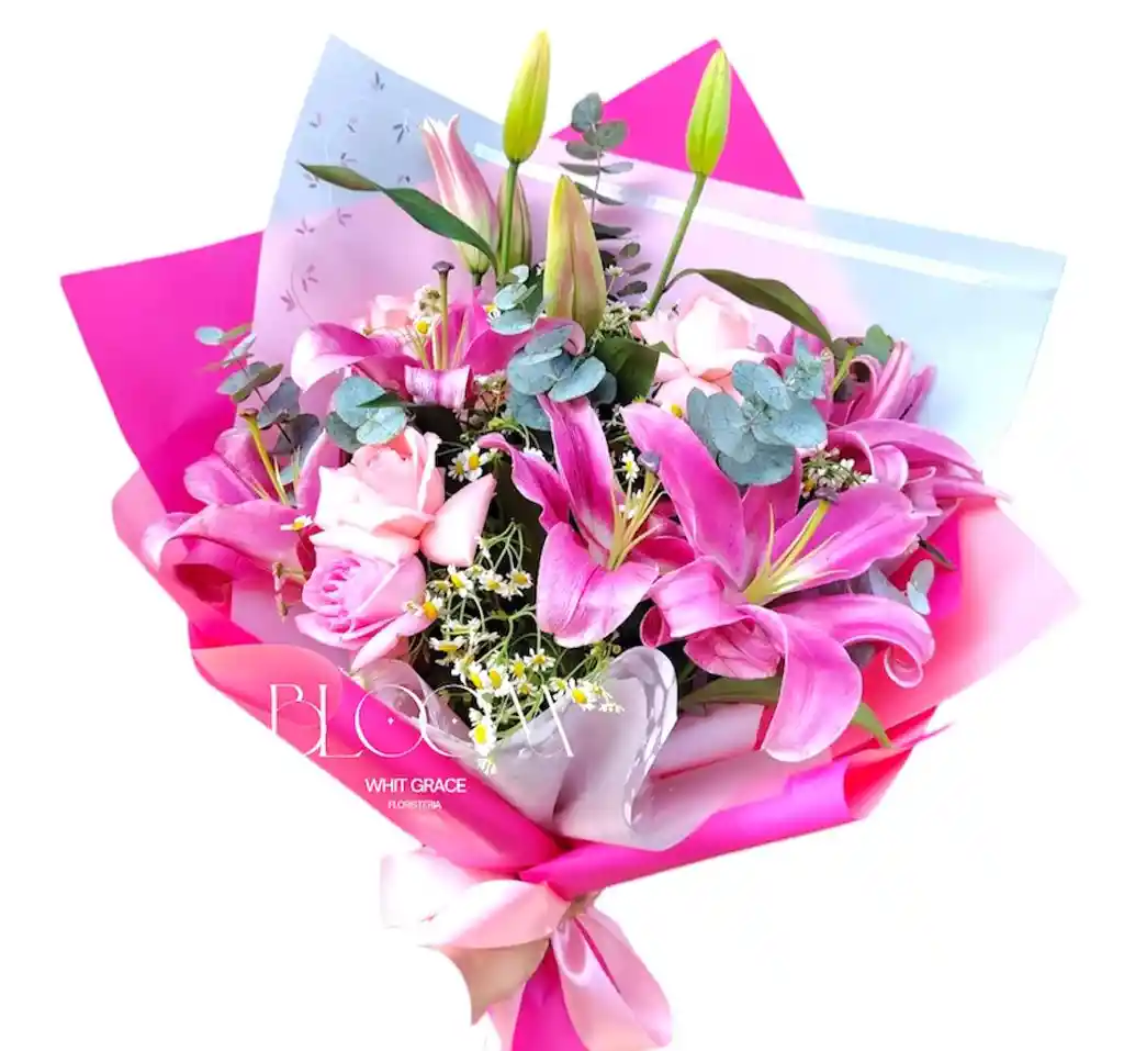 Flores rosas rosadas y lirios frescos listos para ser entregados, un detalle ideal para esa ocasion especial