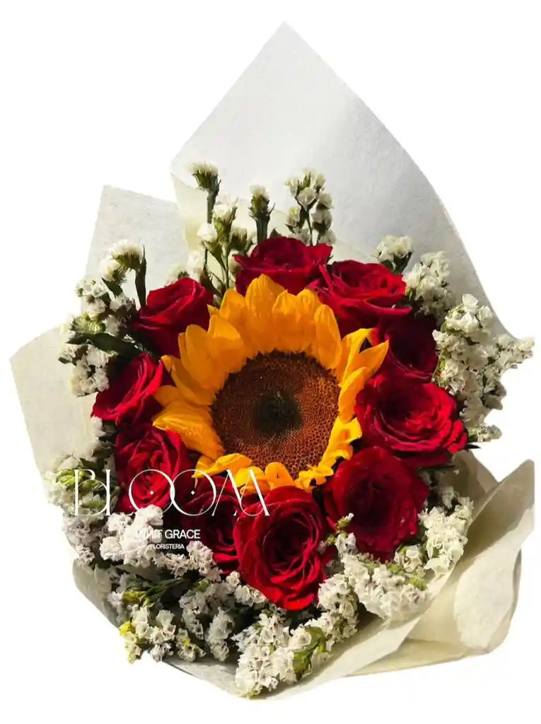 Hermoso bouquet de rosas y girasol en medio, un detalle ideal para todos los días
