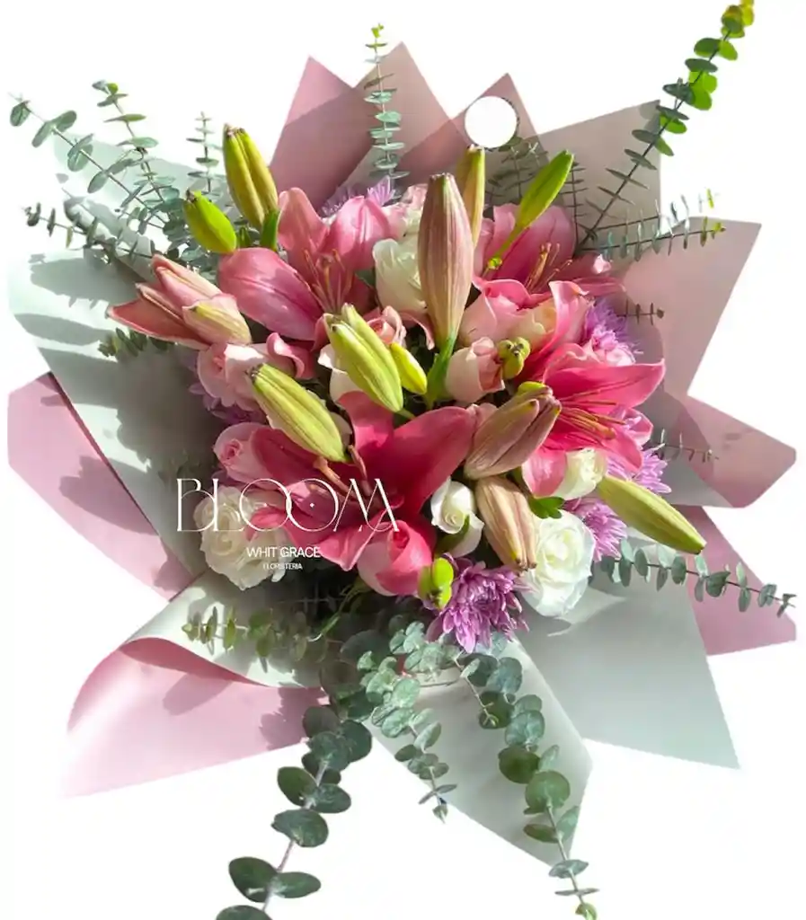 Hermoso bouquet de rosas rosadas y blancas con hermosos lirios de la mejor calidad, un detalle ideal para esa ocasión especial