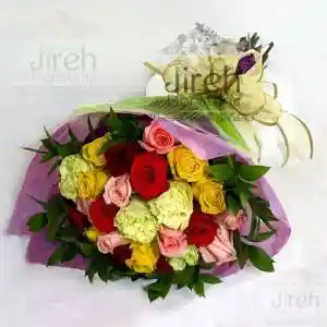 Exclusivo Bouquet por 24 unidades de rosa variada tipo exportación, rusco, fino empaque, moño de cinta de agua exclusivo y tarjeta impresa con mensaje personalizado.