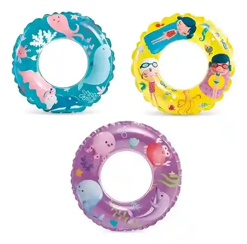 . Flotador Redondo Intex 61 cm . Viene en combinaciones de colores llamativos, con un claro superior de vinilo . Mide 24 cm de diámetro . Hecho de material de poliuretano durable . Puede llegarte en cualquiera de los diseños.