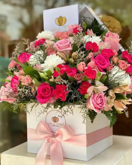 Exprese sus sentimientos con un hermoso diseño floral elaborado por Flor de Helena, con rosas frescas, mini rosas, trifer, clavellinas, caspia, pino venezolano, helecho cuero, en una caja especial para flores.