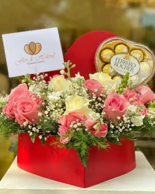 Exprese sus sentimientos con un hermoso diseño floral frutal elaborado por Flor de Helena, con rosas frescas, gypsophilia, pino venezolano, snack dragón, en una caja especial para flores. Incluye Ferrero x 8 unidades