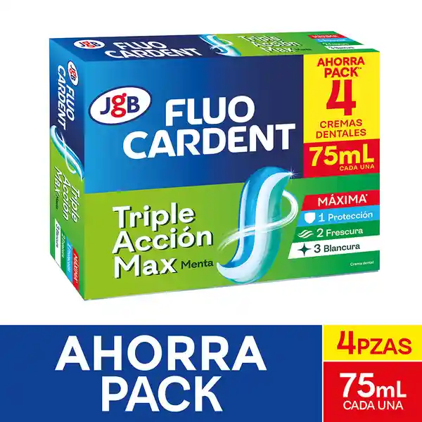 Caja Con 4 Unidades de 75 mL c/u. La Crema Dental Fluocardent Triple Acción Max Garantiza a tu Boca y la de Toda tu Familia Protección Anticaries y Antisarro, Limpieza Profunda Con Una Sonrisa Más Clara, Brillante y Con Aliento Fresco y Prolongado. Recuerda Que es Recomendable Cepillar Tus Dientes 3 Veces al Día Después de Cada Comida. Para Obtener Mejores Resultados Incluye en la Rutina Diaria de Limpieza Oral, Seda y Cepillo Dental Fluocardent.