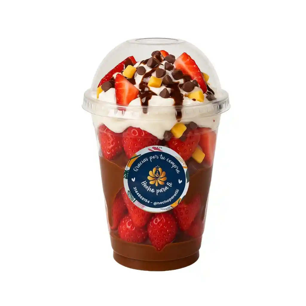 Vaso de fresas con crema, preparado con fresas frescas, trozos de durazno, salsa de chocolate y chips de chocolate. Un detalle dulce y equilibrado, pensado para disfrutar con calma o regalar un momento especial en cualquier ocasión. 🍓🤍