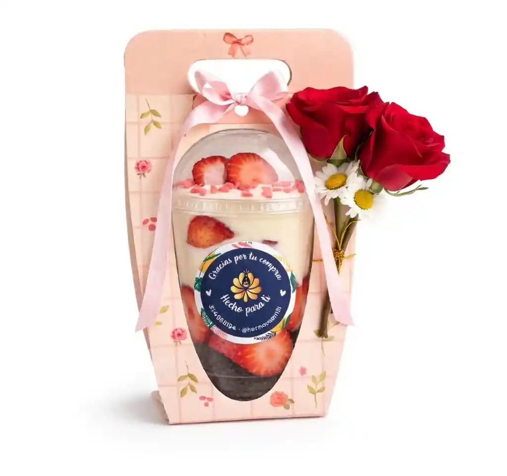 Fresas con crema en una presentación delicada y encantadora que combina sabor y detalle en un solo regalo. Incluye capas de fresas frescas, crema suave, trozos de galleta tipo Oreo y chips de chocolate, acompañadas de un hermoso detalle floral con rosas rojas y flores de temporada, todo presentado en una base elegante lista para sorprender. Perfecto para celebrar, agradecer o tener un gesto especial. Si nos envías tu mensaje, te obsequiamos la tarjeta personalizada para expresar tus sentimientos de manera única