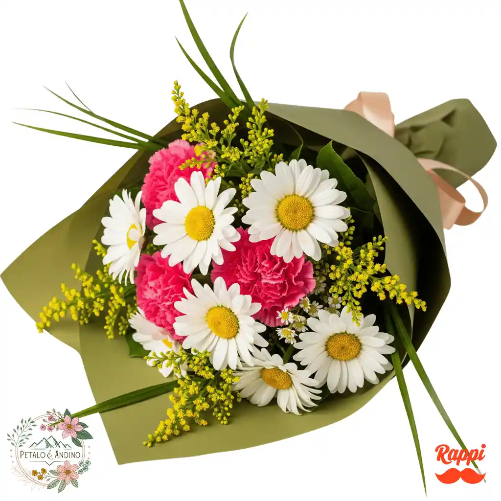 7 margaritas blancas 4 claveles rosados 3 ramitas de solidago 3 ramas de rusco