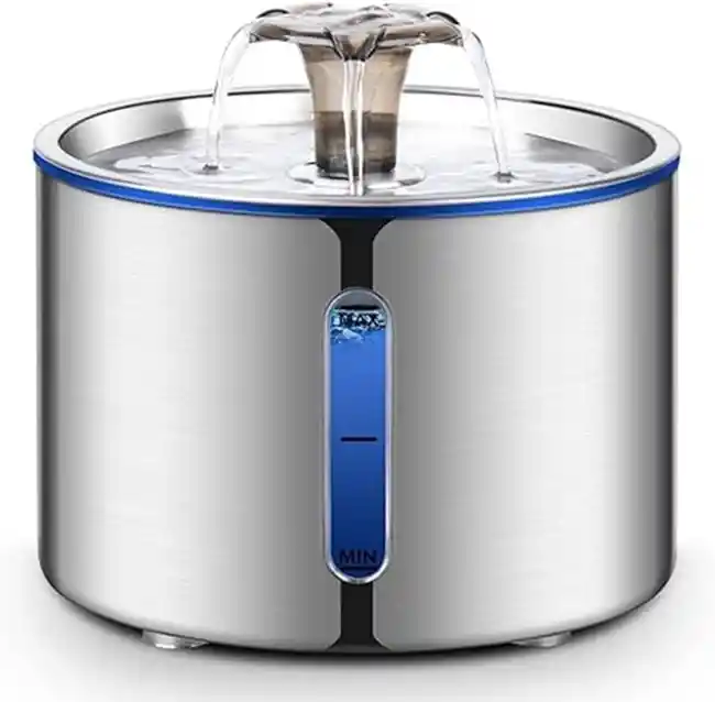 Características: -Fuente para gatos de acero inoxidable: Hecha de acero inoxidable 304 de grado alimenticio, más duradera y resistente a la corrosión, fácil de instalar y limpiar, sin BPA. La parte de acero inoxidable es apta para lavavajillas. Esta fuente de agua para gatos tiene una baja retención bacteriana, que es muy adecuada para gatos, perros y múltiples mascotas. -Gran capacidad de 84 onzas: La capacidad de 2,5 litros de esta fuente de agua para gatos tiene muchas ventajas. Reduce la frecuencia de tus alimentaciones de agua, lo que facilita el mantenimiento de tu mascota. Seguirá alimentando a tu mascota y te dará tranquilidad cuando viajes. Tiene una gran capacidad y es ideal para múltiples mascotas. -Sistema de filtración multicapa: Esta fuente de agua para perros tiene múltiples filtraciones, incluyendo un filtro de carbón activado (que consta de algodón de alta densidad, capa de resina iónica y capa de carbón activado) y una esponja de filtro. El sistema de filtración múltiple filtra el cabello, las partículas de alimentos, los microorganismos y los olores del agua. -Ultra silenciosa: La fuente de agua para gatos contiene una bomba inteligente ultra silenciosa que mantiene el sonido de trabajo por debajo de 30 decibelios. Esta fuente para mascotas te proporciona a ti y a tus mascotas un ambiente tranquilo y cómodo, incluso de noche, sin ningún ruido que te moleste a ti o a tu mascota. -Fácil de desmontar y limpiar: Las fuentes de agua para gatos se pueden montar y desmontar en solo unos minutos, por lo que son fáciles de limpiar y reemplazar. Para la salud de tu mascota, recomendamos cambiar el filtro y limpiar la bomba y la fuente cada 2-3 semanas.