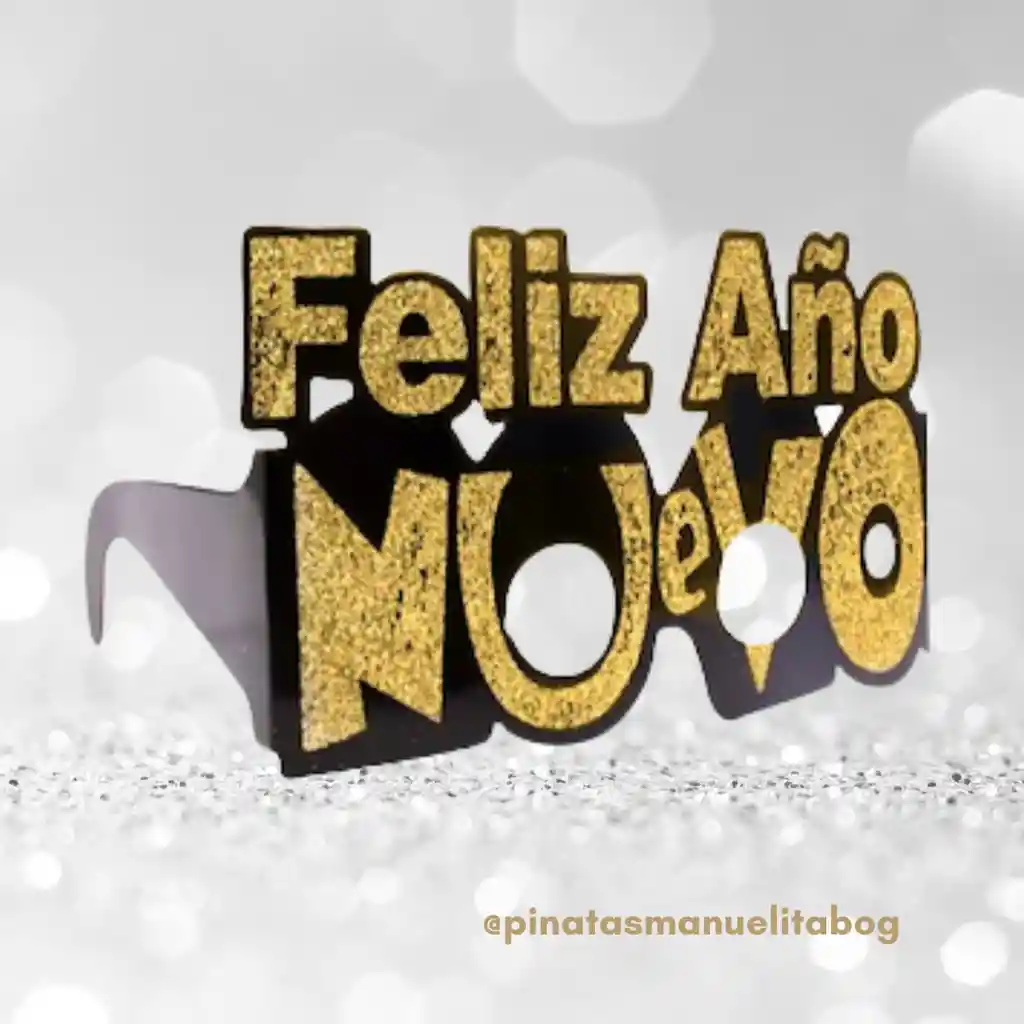 Gafas en cartón en color negro con detalles dorados y estampado Feliz Año Nuevo. Accesorios happy new year, accesorios año nuevo, fin de año 2026.