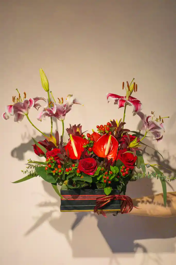 Este diseño es una pieza de alta decoración pensada para ser el corazón de las celebraciones más íntimas. En Roselily, hemos reinterpretado el espíritu navideño a través de una arquitectura floral que combina la tradición del rojo profundo con la sofisticación de texturas exóticas. Presentado en una base rectangular minimalista, este centro de mesa no solo decora, sino que crea una atmósfera de calidez, hospitalidad y elegancia atemporal para compartir momentos inolvidables.