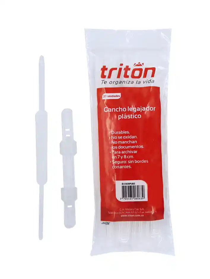 Este gancho permite realizar de manera ágil y eficiente el archivo de documentos, el juego está compuesto por dos piezas fabricadas en polipropileno totalmente plástico anticortante. Se ajusta perfectamente a las ranuras o cortes de los fólder. Características: Capacidad de almacenamiento 280 hojas de 75 g Para perforaciones de 7 y 8 cm. No se oxidan, no manchan los documentos. Flexible de alta resistencia a la manipulación. Estable a temperatura y humedad. Empaque presentación bolsa por 20.