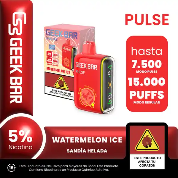 Vapeador Desechable. Contiene 1 Und con batería recargable, precargado Hasta Con 15.000 Puff en modo regular y 7.500 en modo Pulse. Nicotina 5.0Mg/Ml - 5% Puff Inhalaciones. Puede variar según el hábito de uso de cada consumidor. Producto es exclusivo para mayores de edad. Este producto contiene nicotina. La nicotina es un químico adictivo.