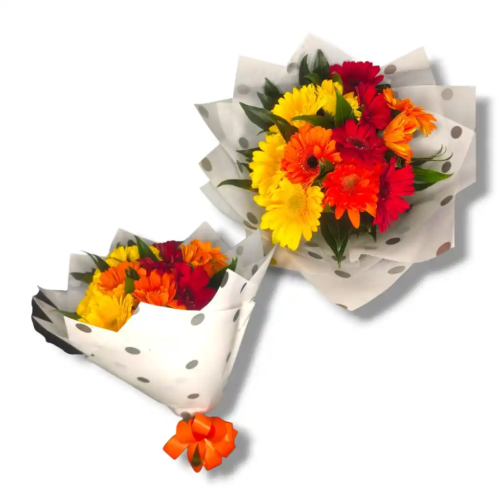 12 GERBERAS COLOR DE LA FLOR SEGUN DISPONIBILIDAD Y FOLLAJE VERDE ENVUELTAS EN PAPEL COREANO ( COLOR DE PAPEL SEGUN DISPONIBILIDAD) Y MOÑO