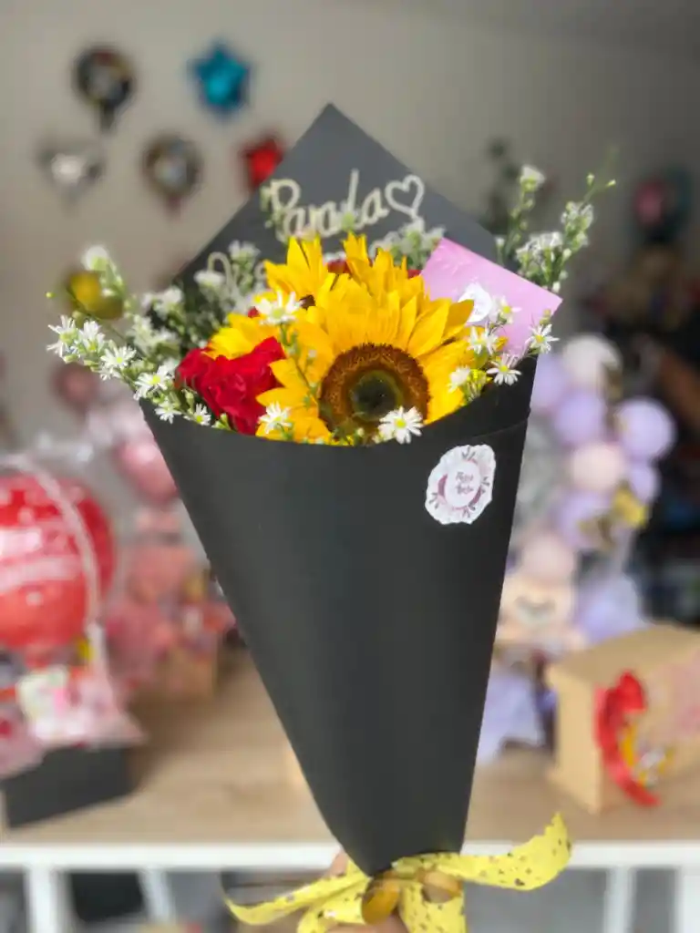 Incluye: girasoles x3, rosas rojas x 13, frase en cartulina en forma de bouquet, decoración y mensaje personalizado