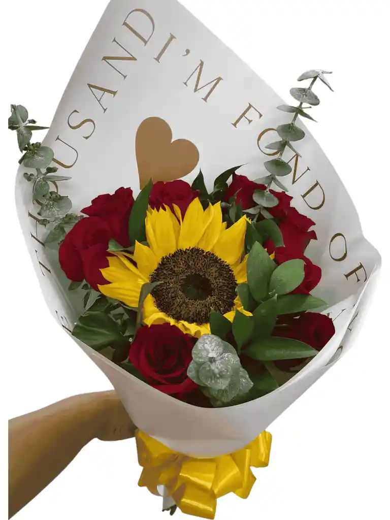 BOUQUET DE 1 GIRASOL CON 8 ROSAS ROJAS, PAPEL COREANO Y FOLLAJE