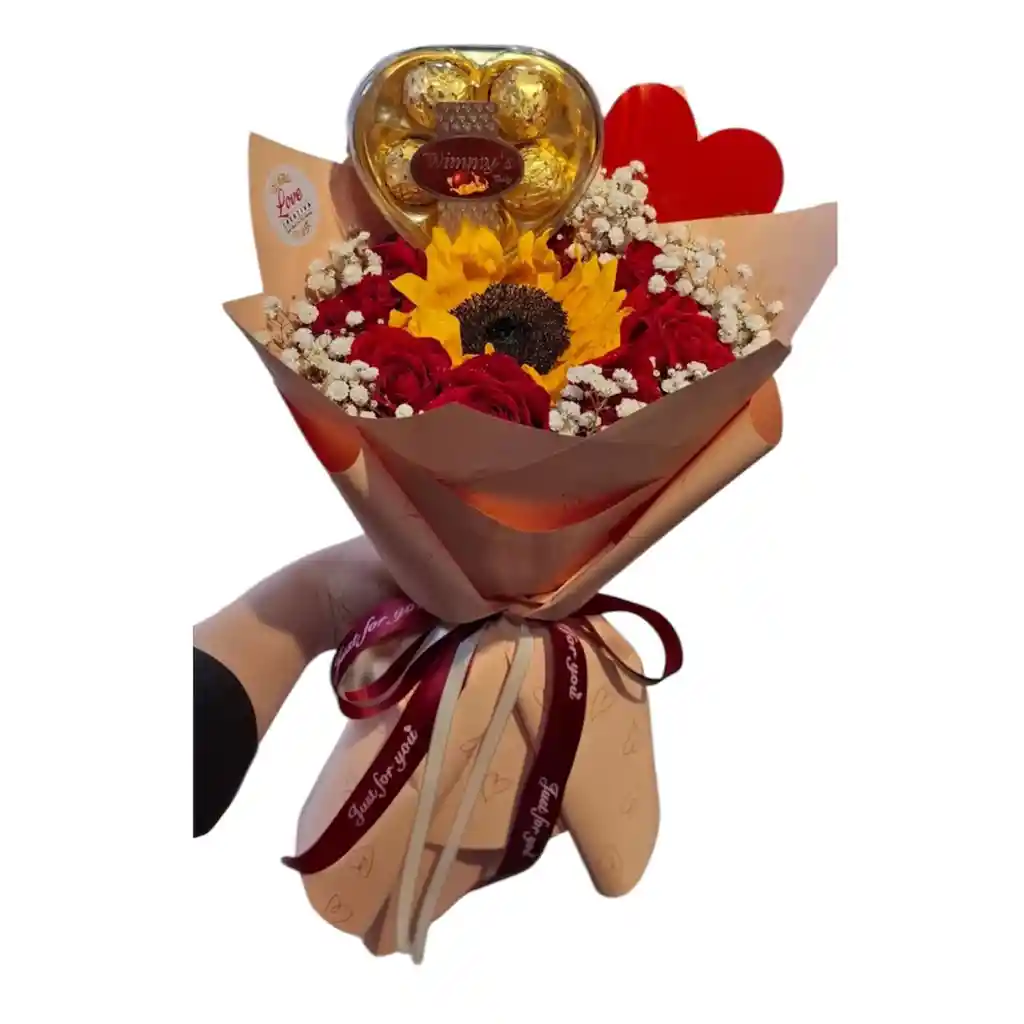 Ramo de rosas rojas con girasol , gipsófila , corazón de ferreros envuelto en papel coreano con lazo
