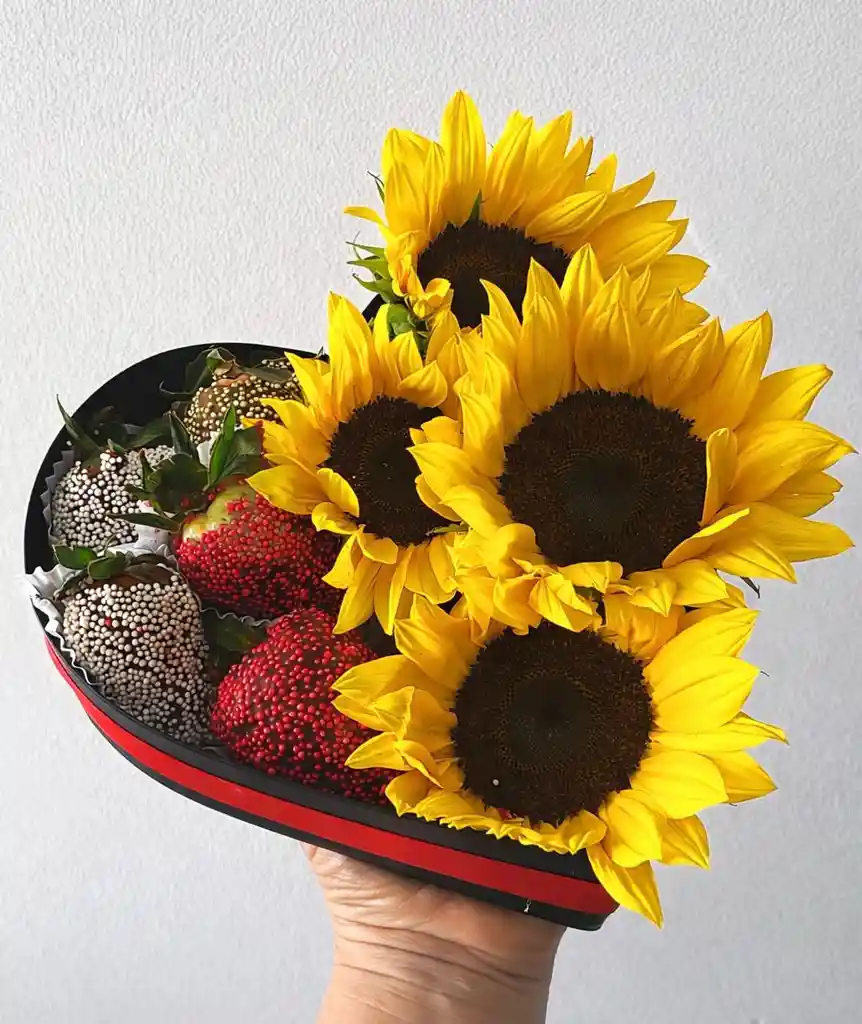 Elaborado en Corazón blanco con tapa en acetato. Incluye: 5 Fresas cubiertas en chocolate negro o blanco 4 a 5 girasoles según el tamaño Cinta roja,moño y tarjeta.