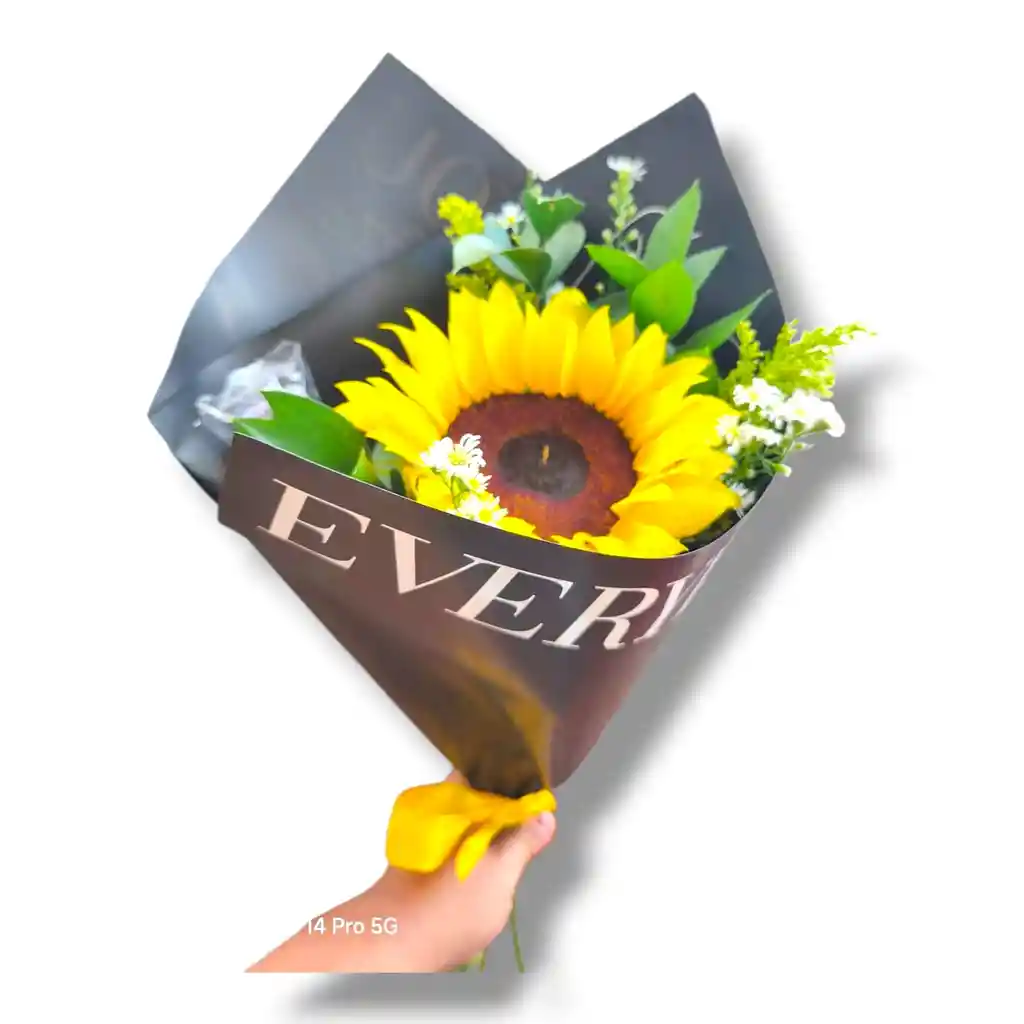 1 GIRASOL CON FOLLAJE VERDE, AMARILLO Y BLANCO ENVUELTO EN PAPEL COREANO ( COLOR DE PAPEL SEGUN DISPONIBILIDAD) Y MOÑO