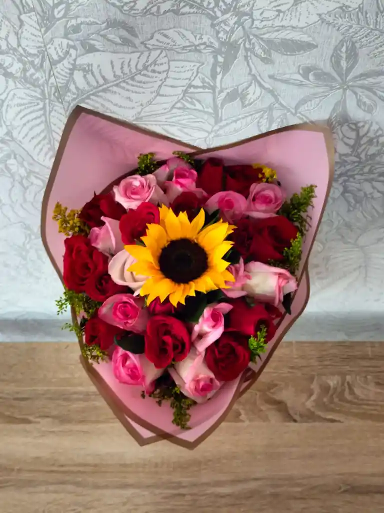 Hermoso Bouquet elaborado con 1 girasol, 12 rosas rojas y 12 rosas rosadas, mas follaje solidago. Envuelto en papel de exportación y moño elegante. Tarjeta personalizada (dejar el mensaje en los comentarios o chat) Ideal para sorprender y/o felicitar a tu ser amado. Flores de la mejor calidad.