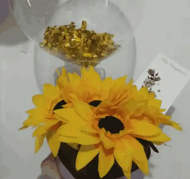 Contenido: 5 a 6 Girasoles 1 Globo Burbuja 1 Domo negro en corazon 1 Moño