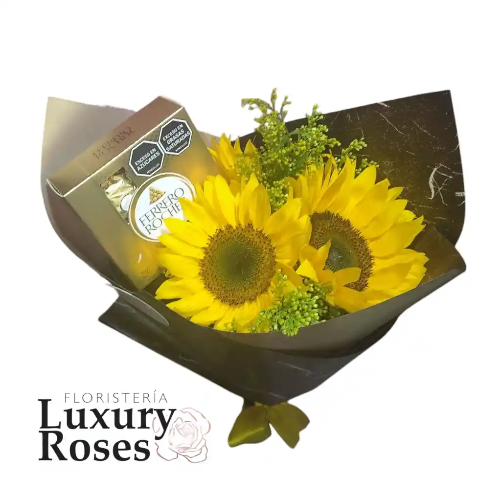 Hermoso boueueth de 3 girasoles , con caja de chocolates por 4 unidades.