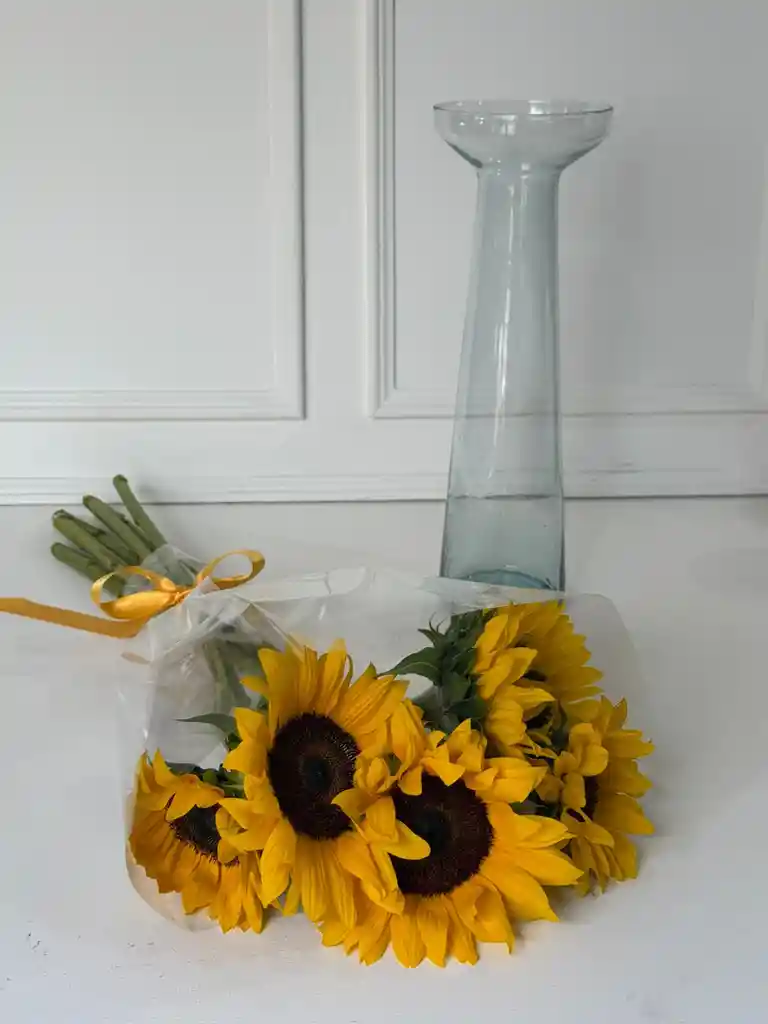 Un florero perfecto para llenar tu hogar de luz y color. Incluye un florero de cristal y un ramo de 6 girasoles frescos, ideal para decorar cualquier espacio con un toque natural y alegre.